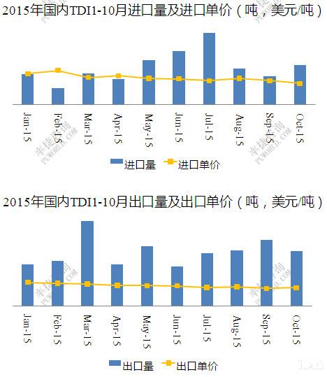 2015年国内1-10月份TDI进口量28585吨,出口量47954吨,净出口量19370吨;进单价方面上半年浮动较大,下半年总体呈现弱行走势;出口单价方面较为平稳,然走势全年呈现弱势下行。