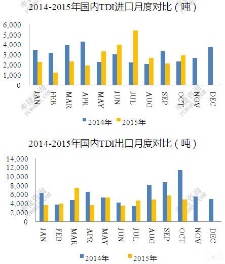 2014年国内进口TDI有37103吨,出口量有73558吨,2015年前十月进口量同比减少6.64%,出口同比减少23.89%。从一个侧面可以看出国内环境、国际环境疲乏难耐。