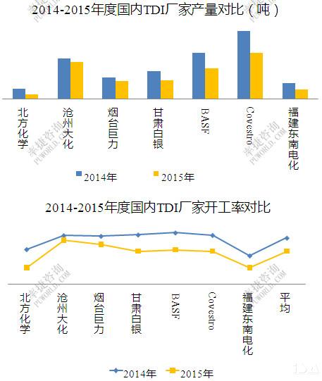 2015年国内TDI厂家整体开工率比2014年偏低,相应产量亦缩减较多,然目前厂家依旧存在库存压力,见全年需求疲乏较为明显。